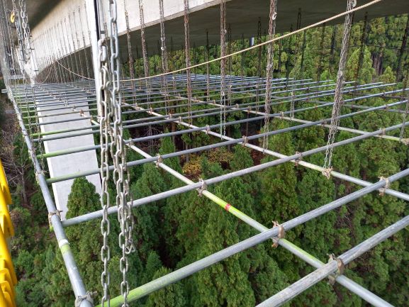 橋梁をメンテンスするために仮設足場(吊り足場)を設置しますが現状はとび職人さんの人力であり命がけです。